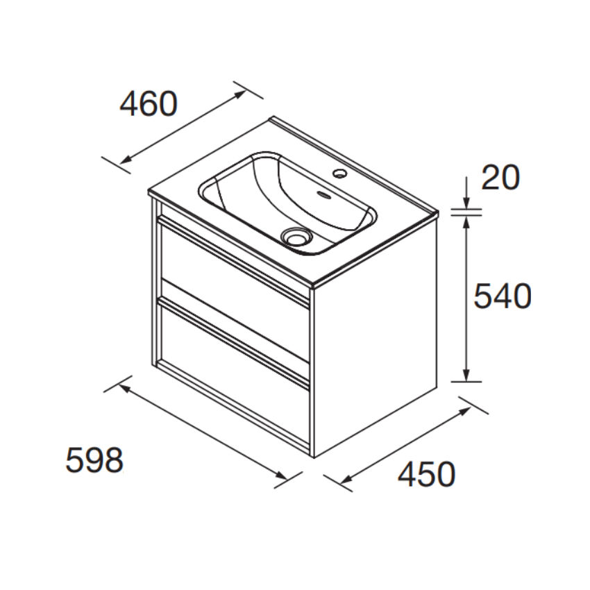 Conjunto de casa de banho composto por móvel suspenso de 600 mm com acabamento Blue Satin e lavatório em porcelana. Dispõe de duas gavetas com fecho amortecido e organizador superior incluído.