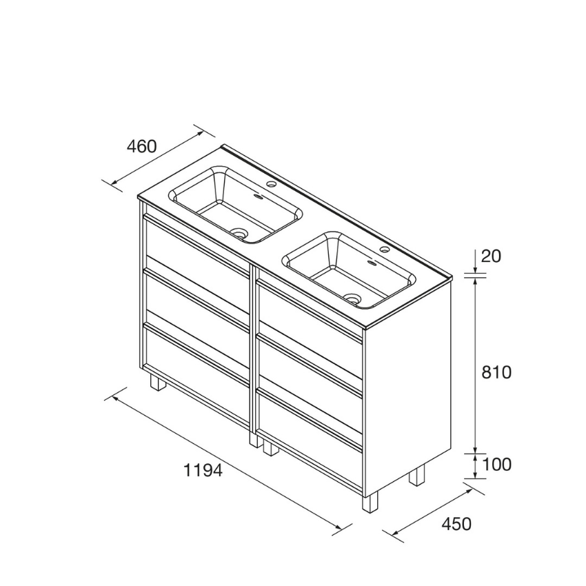 Conjunto de casa de banho composto por um móvel de 1200 mm com lavatório duplo integrado. Dispõe de seis gavetas para máxima arrumação e acabamento em Black Satin. Inclui conjunto de oito pés em preto mate para instalação ao chão.