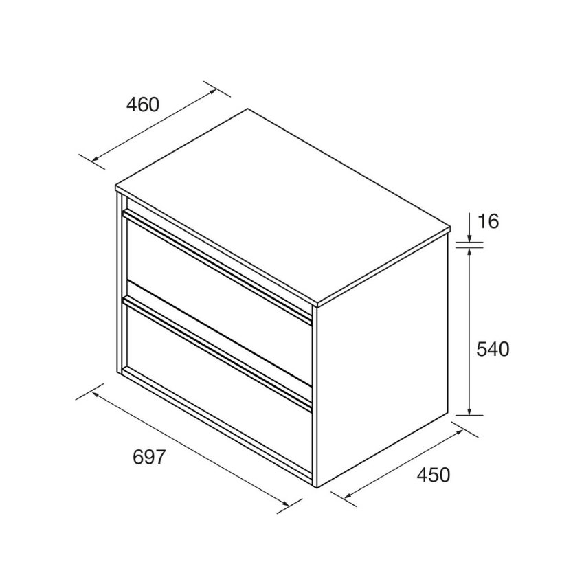 Conjunto de casa de banho composto por um móvel suspenso de 700 mm com tampo liso, concebido para lavatórios de pousar. Apresenta duas gavetas de arrumação com organizador incluído e um acabamento uniforme em Green Satin.