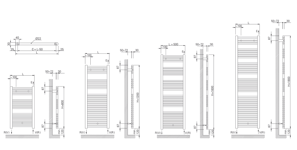 Toalheiro fabricado em aço com coletores verticais de 30×40 mm e tubos horizontais de Ø22 mm.